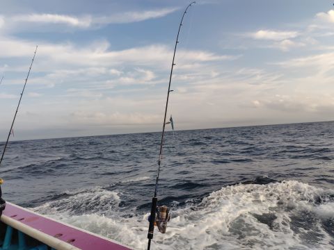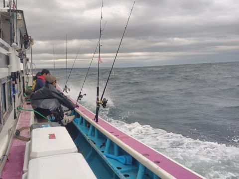 船は揺れるし、波飛沫は掛かるしで、ほとんど我慢比べ状態です。 船室には既にダウンした人が寝ているので、避難しても座る場所がありません。 時計を見ていなかったので正確には判りませんが、40分以上この状況が続いたので、もうげっそりでした。(^^ゞ ようやく次のポイントに着いたので、再び釣りを再開できる、と思いきや、ここで船長から恒例の「ちょっと待って」コールが。 魚の活性を上げるため、船長がカッタクリを始めます。 船長の許可が出るまでジグが落とせないので、ボーっと待つしかありません。(^^ゞ 様子を見ていると、船長のカッタクリにも反応が無いようです。 しばらくして、ようやく釣りができるようになりました。 数投後にヒット、しかし本命の引きではありません。 釣れたのは36cmのツバスでした。