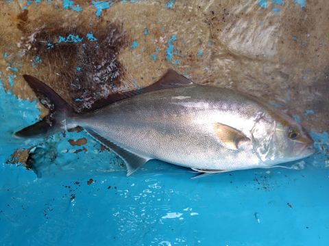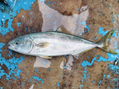 昨年までは早巻き中心であまりシャクリを入れない釣り方だったのですが、昨年の後半は1ピッチジャークに変えるとヒットが出ました。 しかし、指示タナが極端に浅いので、1ピッチジャークでもすぐにジグが水面まで上がってしまい、魚が追いきれないようです。 そこで、今回はかなり細かくシャクリを入れて狙ってみることにしました。 1/4ピッチジャークよりもさらに細かくシャクルような感じです。 正確には、昨年和幸さんがこの釣り方で爆釣していたので、それを真似しているだけなのですが。(^^ゞ その後しばらくしてツバスがヒットしたあと、引きの違う魚がヒット! 釣れたのは33cmのカンパチでした。 小さいですが、ようやく本命が釣れたので一安心です。(^^)
