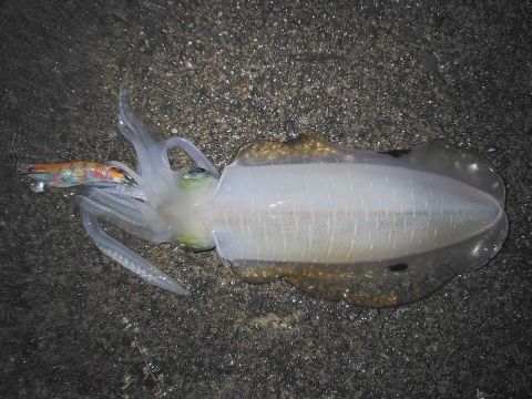 釣れるのは良いのですが、リリーサイズばかり、しかもどんどんサイズが小さくなっています。(^^ゞ やがて東の空が明るくなってきたので、港湾外を狙ってみる事にしました。 1投目、2回目のシャクリでヒット! ちょっと良いサイズです。 釣れたのは胴長18cmのアオリイカでした。 さっきまでチビばかり釣っていたので、これでも結構な大物に見えてしまいます。