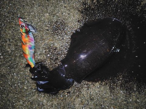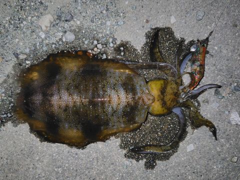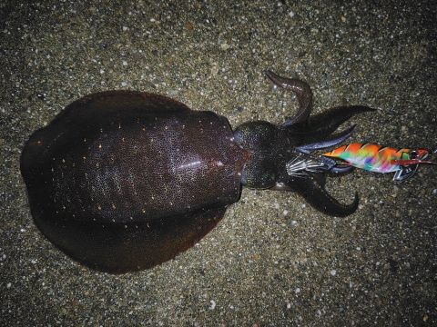 ここではコウイカがメインと聞いていたので、ちょっと意外です。 同じ方向にキャストすると、またヒット! 今度は結構ずっしりとした手応えです。 釣れたのは、胴長19cmのコウイカでした。
