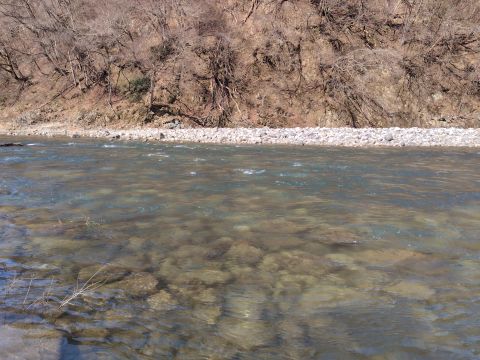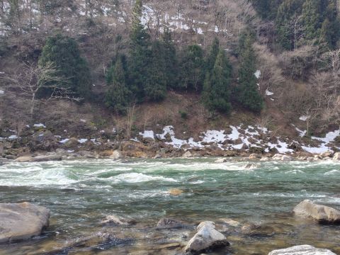 大淵にルアーをキャストしますが、反応はありません。 上流へ移動しながら探っていきますが、反応はさっぱり。 ここでは、過去の釣行で大物が出ているので、毎年竿を出すのですが、数年間に流れが変わってから釣れなくなってしまいました。 しかし、昨年にまた流れが変わり、ヤマメのヒットもあったので、今年は期待していたのですが、今日は雪代で増水しているせいか、まったく釣れません。(^^; がっかりしながら車に戻ります。 その後、もう1ヶ所に竿をだしましたが、そこでもノーヒット。 諦めて車に戻り、早めに昼食を済ませました。 下流側は雪代の増水で厳しそうなので、再び上流へ移動します。 途中、朝には釣り人が3人入っていたので諦めたポイントを見ると、幸い釣り人の姿はありません。 先客の後追いになるのは承知のうえで、ダメ元で入ってみる事にしました。 ここは入渓点からポイントまでの距離が遠く、結構な距離を歩かないといけません。 例年ならこの時期は雪が積もっているので、それほど大変ではないのですが、今年は雪が殆ど溶けてしまい、岩の間に中途半端に残っているので、歩きにくくて仕方ありません。 何度も雪を踏み抜いてしまい、ポイントに着くころにはもうヘトヘトです。(^^;