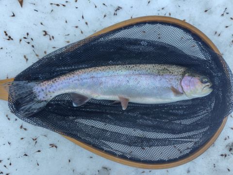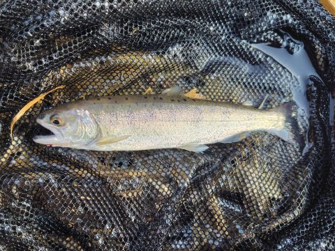 この区間は雪代の影響が少なく、水も透き通っています。 水温を計ると8℃になっていました。 これなら瀬でも釣れるかもと、スピナーをキャスト。 しかし、反応はさっぱり。 やっぱり先客の後追いでは釣れないかと思いつつ、上流へ移動しながら探っていくと、意外にもヒット! 右へ左へと元気に泳ぎ回ります。 それほど大きくはないですが、これは逃がすまいと、慎重に取り込み。 ネットに入ったのは、39cmのニジマスでした。